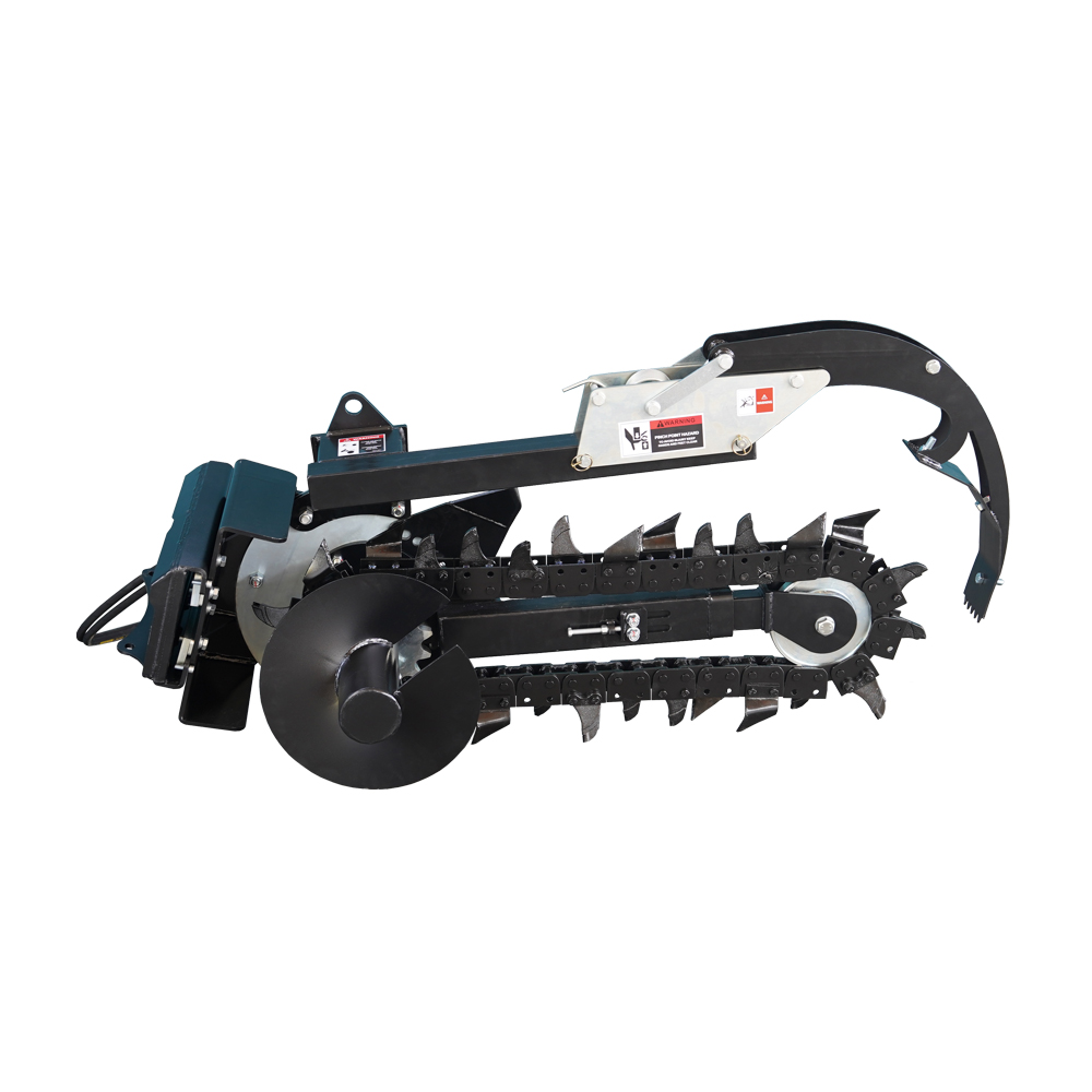 Trencher attachment features an adjustable depth control foot which ensures the operator trenches at a set depth at all times. Three different chain options are also available for trenching in different ground conditions from general earth, to rocky ground, concrete, asphalt, and even frozen ground. Our trenchers are manufactured in-house to the highest industry quality, ensuring reliability and performance.