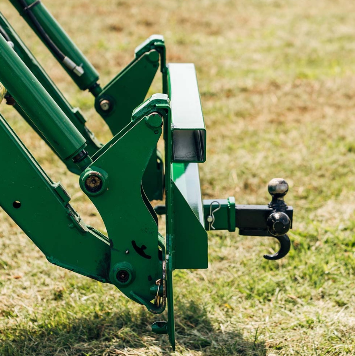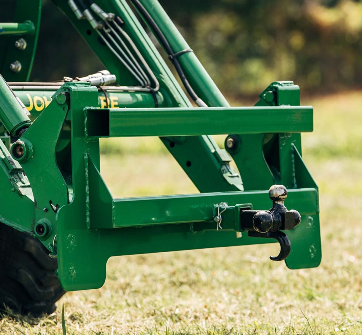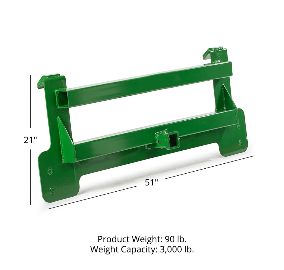 Convert your John Deere front loader into a trailer pulling machine with this 2" received mount plate. Fits most 200 to 500 series loaders.